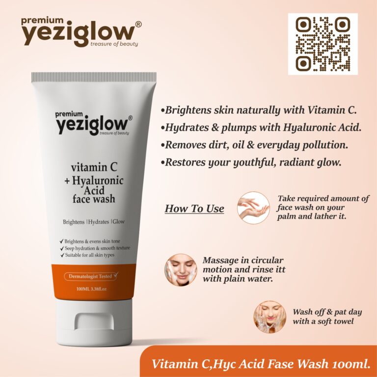 Yeziglow’s Vitamin C + Hyaluronic Acid Face Wash is a brightening and hydrating cleanser infused with Vitamin C, Aloe Vera, and Niacinamide. It helps remove impurities, restores natural radiance, and deeply moisturizes your skin for a fresh, glowing, and youthful look every day.What it does: